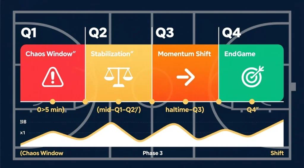 Basketball ist nicht linear. Es gibt Phasen mit unterschiedlichen Dynamics. Wer diese Phasen versteht, kann sie für Live-Wetten nutzen. Ich hab über zwei Jahre Daten gesammelt und klare Muster gefunden. Diese Phasen wiederholen sich Spiel für Spiel.